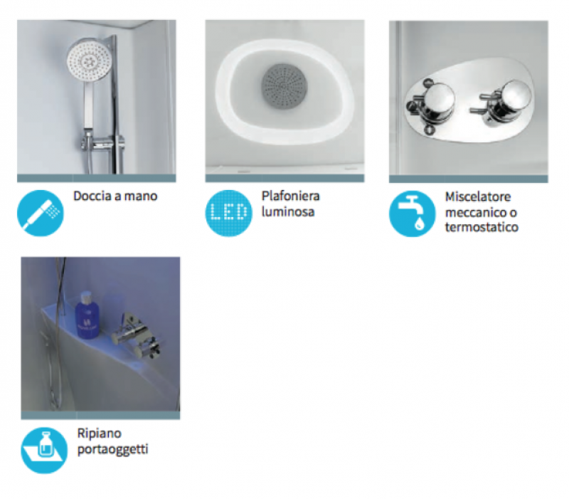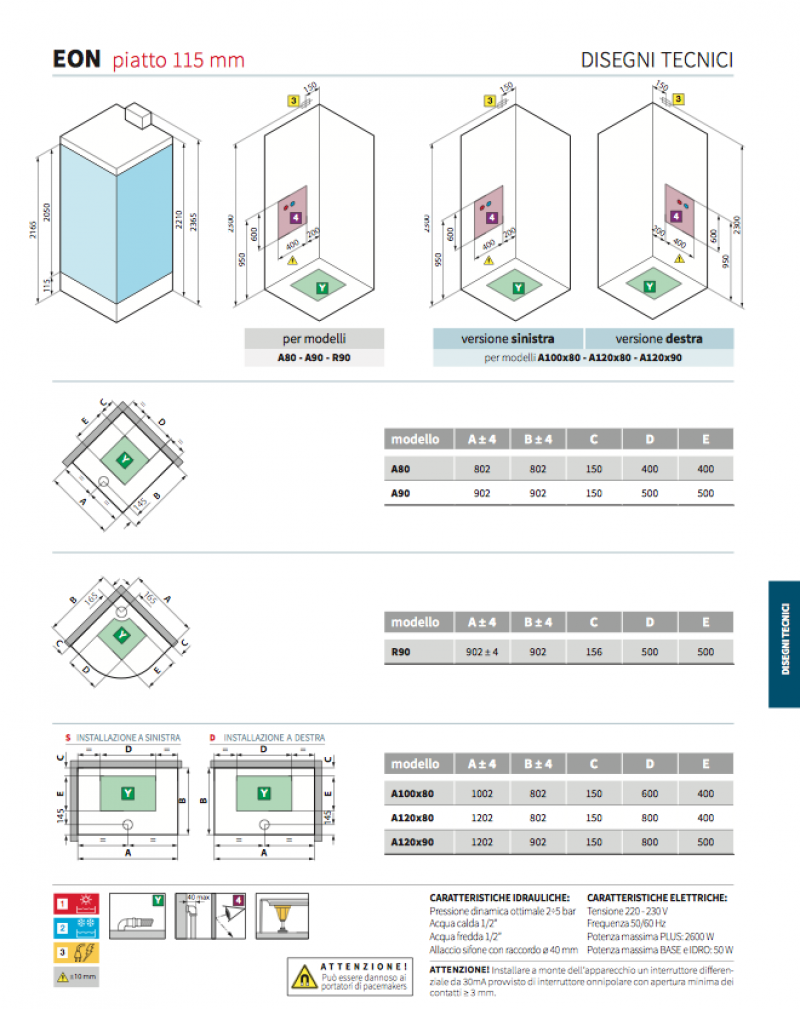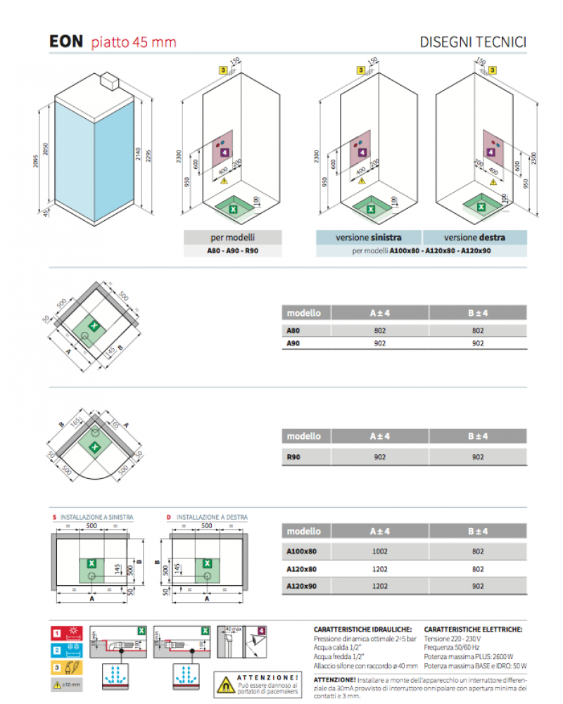L' esclusività dei sistemi benessere Novellini dalle linee sinuose ed eleganti, Eon offre la soluzione definitiva a tutti i problemi di umidità e fuoriuscita d' acqua nel vostro bagno, donando allo stesso grande impatto estetico e confort, non dimenticando l' incredibile rapporto qualità/prezzo. Cabina doccia completa di pannelli a parete in metacrilato bianco nelle finiture lucido o morbido (opaco), pareti in cristallo temperato trasparente 6 mm. completi di trattamento antigoccia Crystal Clear, piatto doccia in metacrilato bianco disponibile in 2 altezze (H 4,5 e H 11,5), piletta di scarico, miscelatore meccanico/termostatico, doccetta a mano saliscendi, ripiani portaoggetti, con o senza tettuccio (il modello con tettuccio completo di plafoniera led luminosa luce bianca). Disponibile nelle seguenti misure e caratteristiche: 2P120x90 cm. apertura 1 anta scorrevole e 1 fissa in linea con fisso laterale, 2P120x80 cm. apertura 1 anta scorrevole e 1 fissa in linea con fisso laterale, A100x80 cm. apertura 2 ante scorrevoli e 2 fisse, A80x80 cm. apertura 2 ante scorrevoli e 2 fisse, A90x90 cm. apertura 2 ante scorrevoli e 2 fisse e GF90x90 cm. apertura 1 anta battente con fisso laterale. I profili delle pareti in vetro sono disponibile nei colori bianco, silver o cromo. La cabina é installabile nella versione destra o sinistra per le misure rettangolari (vedi foto verso). Per effettuare l' ordine selezionare le caratteristiche nel menù a tendina: versione e misure, miscelatore meccanico o termostatico, con o senza tettuccio, colore profilo e finitura pannello (bianco lucido o bianco morbido). La cabina viene fornita col piatto H 4,5 di serie, se si desidera il piatto H 11,5 indicarlo prima di concludere l' ordine nell' apposito spazio "informazioni aggiuntive sui prodotti" insieme al verso Dx/Sx (solo per le cabine rettangolari). Il trasporto si intende standard, per esigenze particolari ( consegna al piano, consegna su appuntamento...) contattare il servizio clienti per un preventivo.