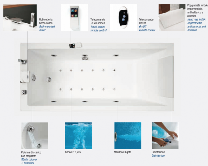 Vasca idromassaggio rettangolare, misure 150x70, 160x70,170x70, 170x75, 170x80 e 180x80 cm., il prezzo non cambia, completa di: sistema idromassaggio Whirlpool 6 jets, telaio, 2 pannelli frontale e laterale, colonna di scarico, telecomando On/Off, n. 1 poggiatesta In Eva impermeabile, antibatterico ed atossico. Non comprensiva di rubinetteria bordo vasca, selezionabile nei prodotti correlati in fondo alla pagina. La vasca é reversibile. Il trasporto si intende standard, per esigenze particolari ( consegna al piano, consegna su appuntamento...) contattare il servizio clienti per un preventivo.