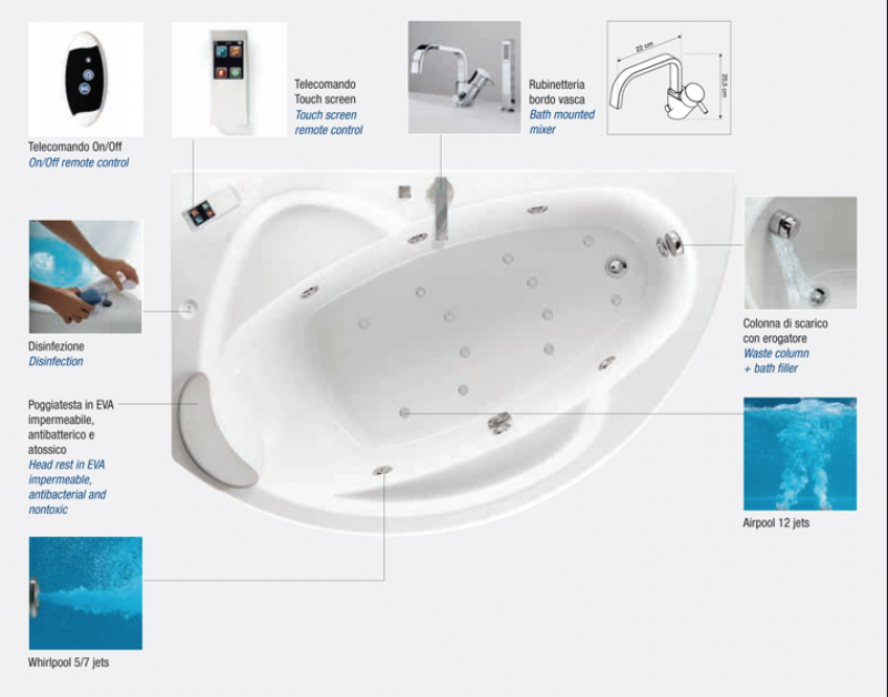 Vasca angolare asimmetrica idromassaggio, misure 150x85 e 165x85, il prezzo non cambia, completa di: telaio, 1 pannello, colonna di scarico, sistema idromassaggio Whirlpool 6 jets, Airpool 12 jets, telecomando Touch Screen, disinfezione, n. 1 poggiatesta in Eva impermeabile, antibatterico e atossico. Non comprensiva di rubinetteria bordo vasca, selezionabile nei prodotti correlati in fondo alla pagina. Selezionare la versione destra o sinistra. Il trasporto si intende standard, per esigenze particolari ( consegna al piano, consegna su appuntamento...) contattare il servizio clienti per un preventivo.