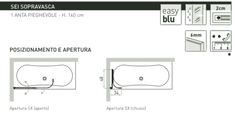 Parete sopravasca Sei, senza telaio, cerniere a filo vetro cromate e guarnizione ultratrasparente in pvc antimuffa di ridotte dimensioni per una facile pulizia, profili dotati di tappo di chiusura, apertura interno/esterno, estensibilità 2,0 cm. (97,5-99,5 cm.). Cristallo temperato spessore 6 mm. nelle finiture trasparente. Profili in alluminio nelle finiture argento lucido. Selezionare il prodotto nel verso (Dx o Sx) desiderato (vedi schemi). Per aggiungere il trattamento protezione vetro selezionare nei prodotti correlati in fondo la pagina. Il trasporto si intende standard, per esigenze particolari ( consegna al piano, consegna su appuntamento...) contattare il servizio clienti per un preventivo.
