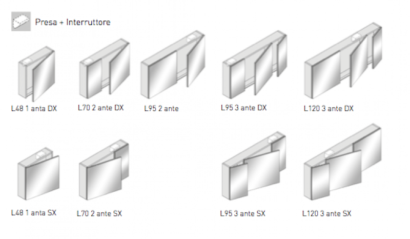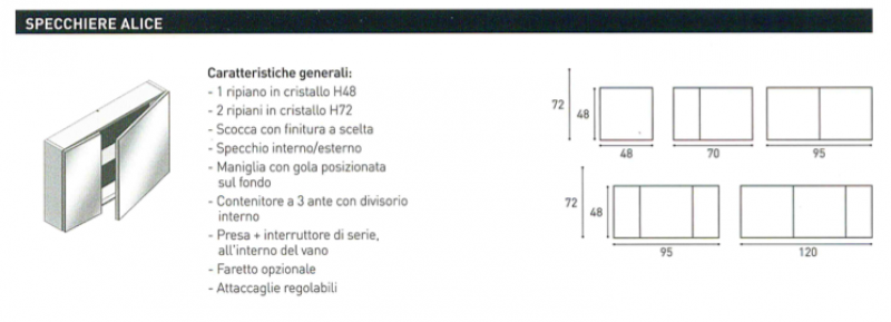 Specchiera contenitore sospesa, altezza 48,0 o 72,0 cm., profondità 14,0 cm., a 1, 2 o 3 ante, con presa maniglia a gola integrata nella parte bassa dell' anta. La scocca é realizzata in conglomerato ecologico di legno idrorepellente V70 classe E1, atossico e a basso contenuto di formaldeide, finitura effetto legno Olmo, laccato lucido o laccato opaco. Le ante sono in conglomerato ecologico spessore 18 mm. rivestite internamente ed esternamente a specchio, dotate di chiusura ammortizzata con regolazione della velocità di chiusura, cerniere regolabili e a sganciamento rapido. All' interno é posizionato 1 ripiano in cristallo per H48, 2 ripiani per H72 e presa + interruttore di serie. Il contenitore a 3 ante é completo di divisorio interno. Misure disponibili specchiera : LxPxH, 48x14x48, 48x14x72 (con 1 anta), 70x14x48, 95x14x48, 70x14x72, 95x14x72 (con 2 ante), 95x14x48, 120x14x48, 95x14x72 e 120x14x72 cm. (con 3 ante) vedere scheda disegno (le immagini sono solo esempi). Selezionare il prodotto delle misure e finiture desiderate dal menù a tendina oppure in fondo alla pagina e prima di concludere l' ordine indicare nell' apposito spazio "informazioni aggiuntive sui prodotti" il colore scelto, visibile sulla scheda colori o scheda legno olmo. Specificare nell' apposito spazio, tranne per le specchiere misura L 95,0 cm. a 2 ante, anche il verso di apertura se Sx o DX (vedere scheda disegno). E' possibile prevedere un faretto opzionale da posizionare sopra la specchiera, selezionabile tra i prodotti correlati in fondo alla pagina. Il trasporto si intende standard, per esigenze particolari ( consegna al piano, consegna su appuntamento...) contattare il servizio clienti per un preventivo.